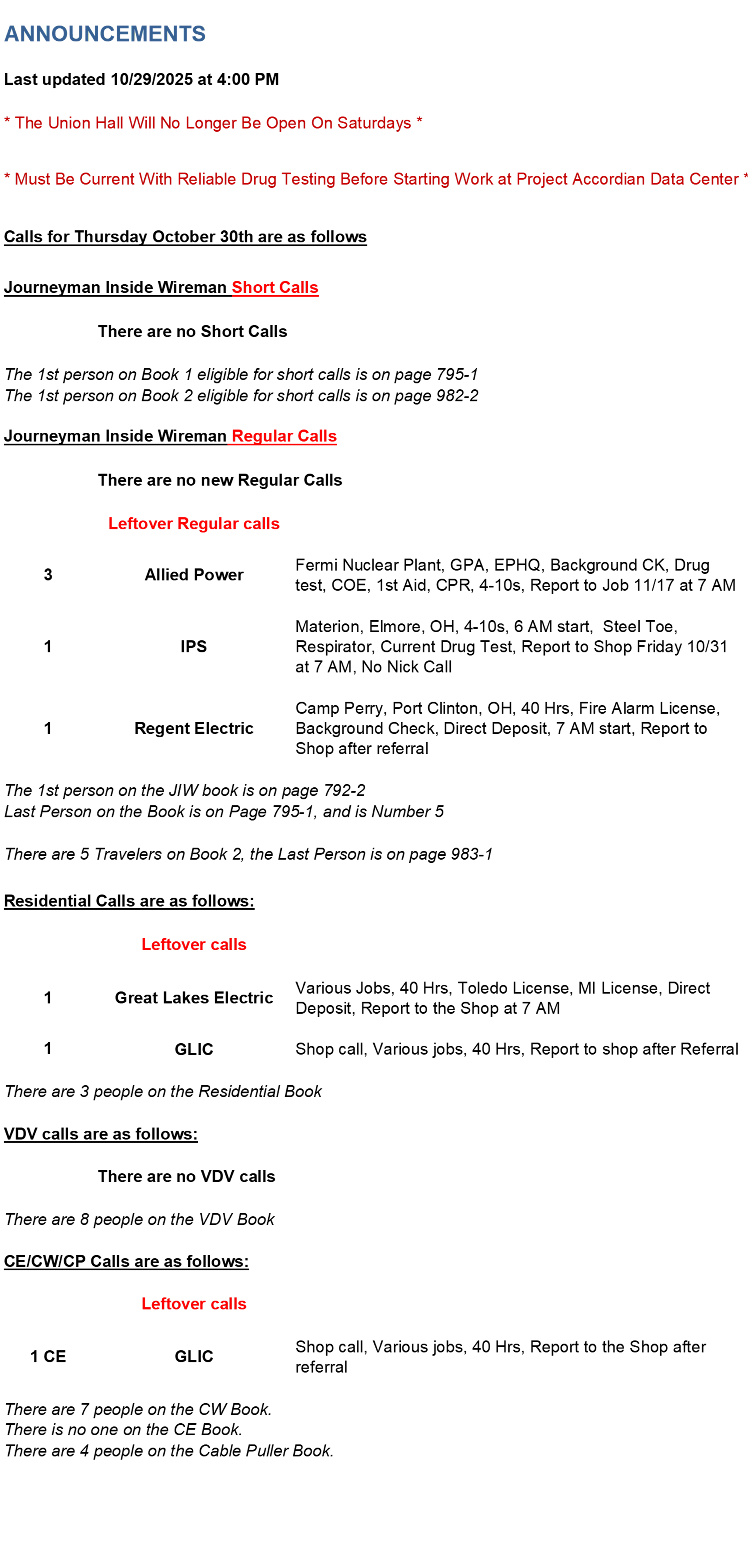 To enlarge the job calls below please click the PDF below: Daily Job Calls PDF